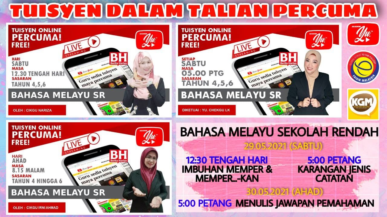 Setiap minggu Panitia Bahasa Melayu Sekolah Rendah menyajikan kelas tuisyen siaran langsung secara dalam talian PERCUMA buat murid-murid dari tahun 1 hingga tahun 6. Kelas tuisyen ini terbuka untuk murid-murid Sekolah Kebangsaan (SK) dan Sekolah Jenis Kebangsaan (SJKC dan SJKT). Kelas tuisyen percuma ini dibawakan khas oleh Akademi Youtuber dengan kerjasama eDidik Malaysia dan Kelab Guru Malaysia (KGM).